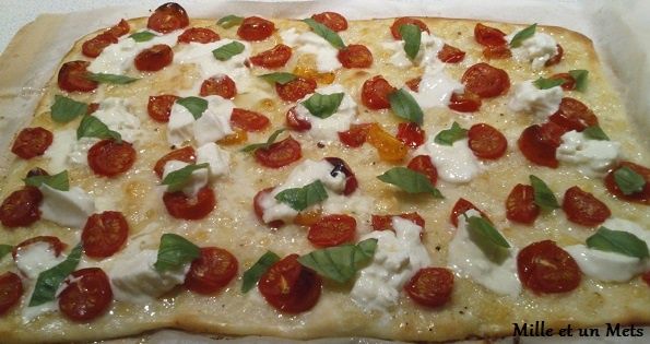- A la sortie du four, ajoutez la burrata pressée et les feuilles de basilic émincées ou entières puis un coup de poivre du moulin et légèrement de l'huile d'olive.
