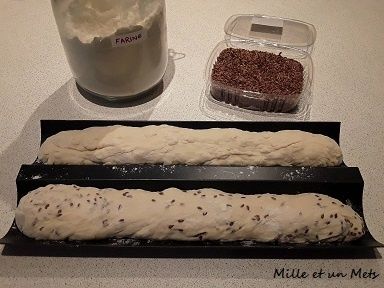 - Partagez votre pâte en 2. Ajoutez si envie vos graines et mélangez-les à la pâte. Formez vos 2 baguettes et installez-les dans des moules à baguettes (perforés ou non, le mien ne l'est pas).